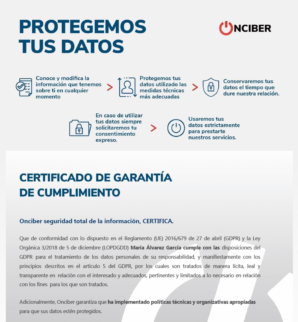 María Álvarez García es la RESPONSABLE del tratamiento de los datos personales del USUARIO. Estos datos serán tratados de conformidad con lo dispuesto en el Reglamento (UE) 2016/679, de 27 de abril (GDPR), y la Ley Orgánica 3/2018, de 5 de diciembre (LOPDGDD).